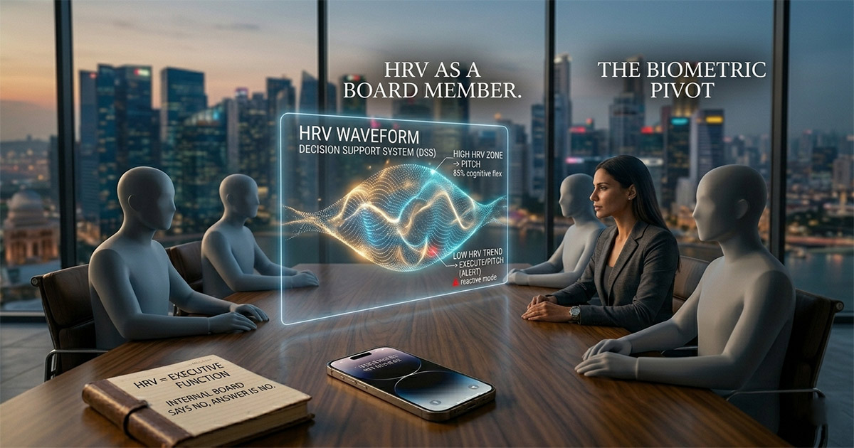 - The Strategy: This is your window for High-Stakes Persuasion. When your HRV is in its top 20th percentile, your ability to read the room and handle “curveball” questions from investors is at its peak.