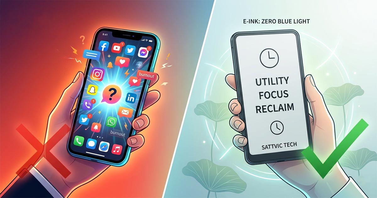 Unlike OLED or LCD screens that blast light directly into your retinas, E-Ink reflects ambient light, just like paper. This makes it the perfect tool for the Sattvic lifestyle, allowing for connectivity without disrupting the body’s natural melatonin production.